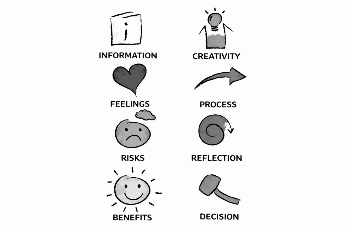 When you show an icon, you make the “thinking invitation” visible — information, creativity, concerns, benefits, feelings, process, reflection, decision.